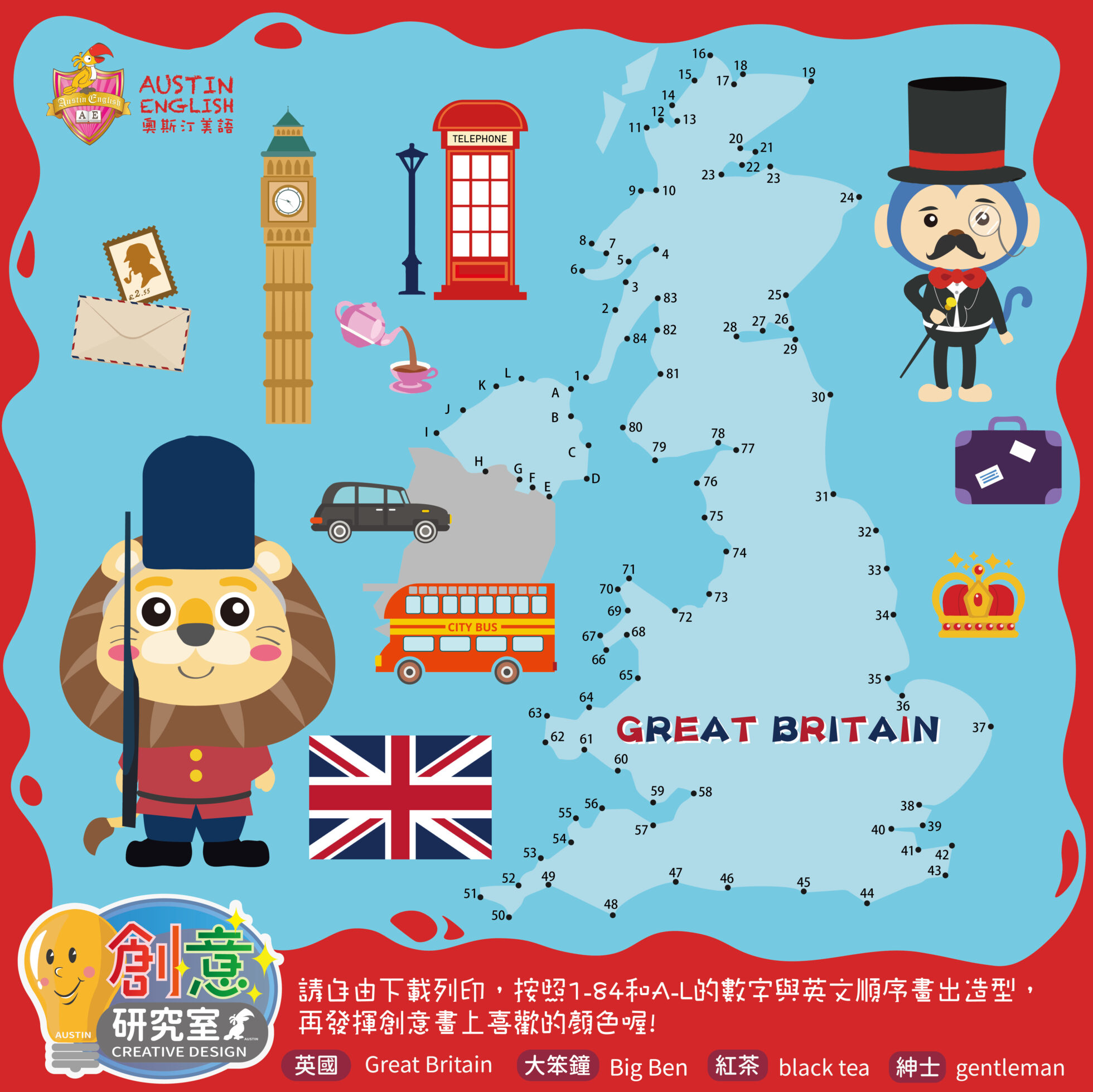 請自由下載列印,按照1-84和A-L的數字與英文順序畫出英國的輪廓,